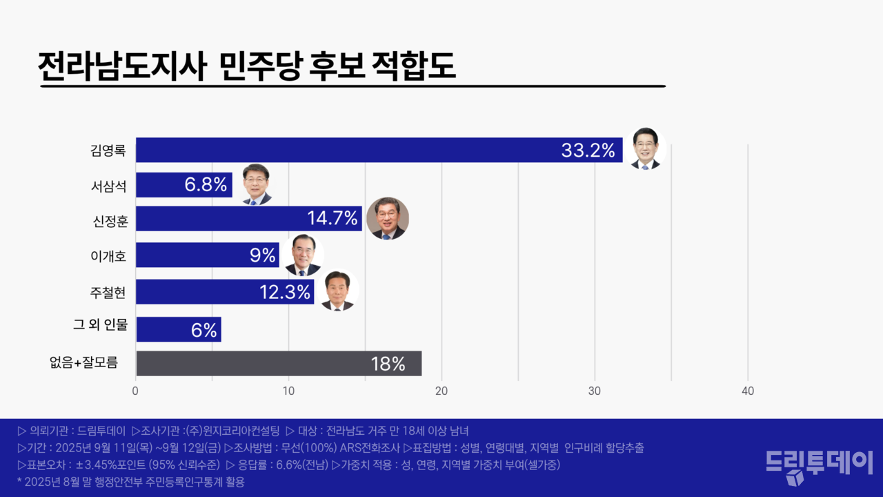 드림투데이가 여론조사기관 윈지코리아컨설팅에 의뢰해 휴대전화 가상번호를 사용해 전남 거주 만 18세 이상 남녀 808명을 대상으로 구조화된 설문지를 이용한 무선 자동응답(ARS·100%) 조사 방법으로 11~12일 내년 6월 지방선거를 앞두고 전남도지사 후보 적합도를 조사했다.