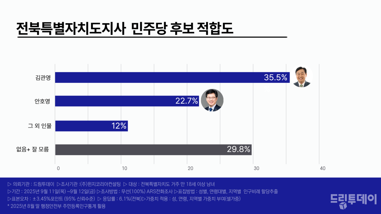 민주당 후보군만 놓고 도지사 적합도를 물은 결과에서도 김관영 지사가 35.5%로 1위를 유지했다. 안호영 위원장은 22.7%로 나타났으며, 그 외 다른 인물은 12.0%, 적합한 후보가 없거나 잘 모르겠다는 응답은 29.8%를 기록했다.