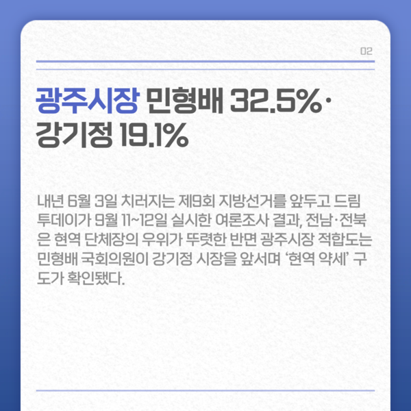 광주시장 민형배 32.5%·강기정 19.1%, 전남지사 김영록 28.6%·신정훈 12.2%