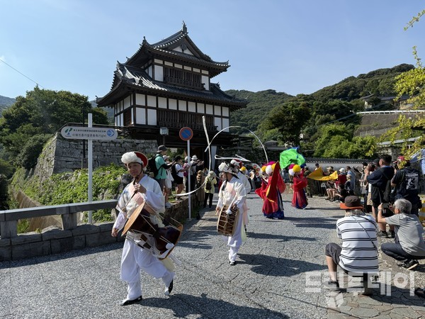 정갈하게 다듬어진 가네이시 성터로 가니 이미 옷을 갈아입은 행렬들이 시작의 신호음만 기다리고 있었다. 나는 부산시의원으로 오셔서 통신사의 가장 수장인 정사와 부사를 맡으신 분들과 기념사진을 찍었다. 드디어 시작된 행렬은 쓰시마 번주를 비롯한 일본이 무사들이 길을 트고 뒤를 이어 국서를 실은 가마가 이어가고 다음에는 한국에서 온 취타대가 행렬이 다가옴을 알리는 연주를 한다. 그 뒤에 정사와 부사와 종사관이 가마를 타고 따르며, 뒤를 이어 부산의 춤패 배김새가 한국 고유의 춤으로 행렬을 장식하고, 다음으로 풍물패가 이어지는 300여명이 참여하는 대규모 퍼레이드가 이즈하라 시내를 관통했다.