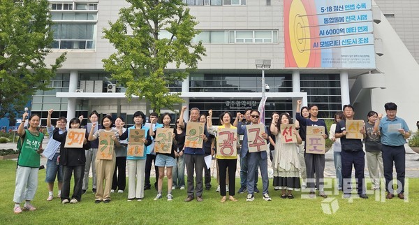 22일 오후 광주조직위는 광주시청 앞에서 기자회견을 열어 “올해 광주·전남 지역은 유례없는 폭우와 폭염 피해를 동시에 겪으며 기후 위기의 심각성을 누구보다 절실히 체감했다”면서 “일상화된 기후재난 앞에서 더 이상 개인의 노력만으론 한계가 분명하다. 모두가 함께 행동해 이 위기를 극복해야 한다”고 말했다.