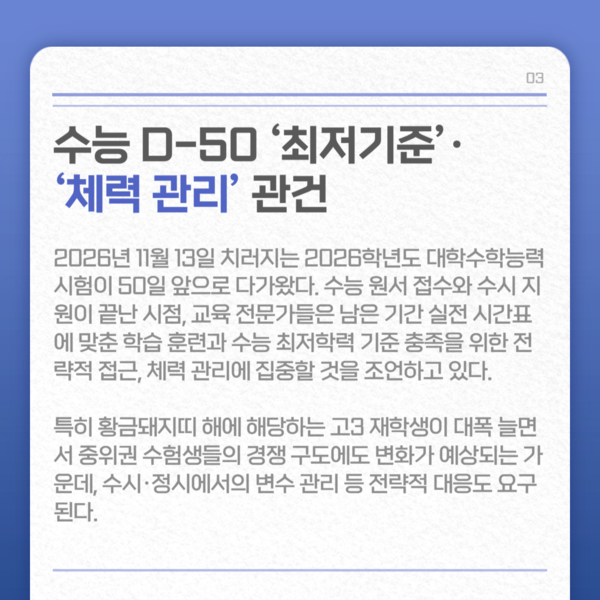 수능 D-50 '최저기준'·'체력 관리' 관건