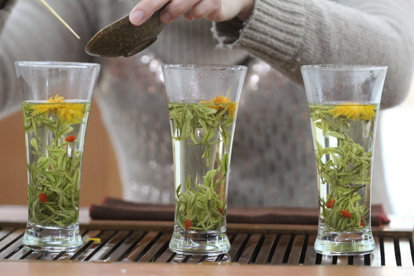 ▲봉황삼점두(鳳凰三點頭): 점두(點頭)는 중국어로 ‘고개 숙여 인사한다’라는 뜻이고, ‘봉황삼점두’는 봉황이 세 번 머리를 조아리는 것과 같이 차를 우려서 대접하는 손님을 공경한다는 뜻이다. 중국 다예(茶藝) 가운데 전형적인 기능과 예술이 결합 된 것이며, 고급 녹차나 홍차를 우려낼 때 쓰는 수법이다. 위에서 언급한 고충(高衝)은 바로 봉황삼점두의 일부분이라고 생각해도 좋다. 구체적인 요령으로는 낮은 곳에서 물을 따르기 시작하여 높은 곳으로 이어지는 동작에서 물이 끊기지 않고 아래로 떨어지게 한다. 기울여주는 손목의 스냅을 이용하여 끌고 당기는 모양으로 물을 채워준다. 이 동작을 세 번 반복하며, 찻잎이 물속에서 서로 뒤집히며 물을 충분히 흡수하도록 하는 데 그 목적이 있다.