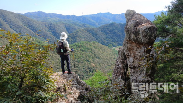 망원석(望遠石)은 촛대처럼 우뚝 솟은 5m 높이의 바위로, 남근석 모양이다. 스님들이 도를 닦던 곳이라는 안내문과 함께 시야가 뚫리며 병무산, 제암산 능선이 너울처럼 보인다. 계속 오르막이 이어지는 곳에 ‘공주 이씨’ 묘 보호를 위한 붉은 벽돌 담장을 지나고 나면 갈림길 삼거리다. 이정표는 ‘정상 0.5km’ 이곳부터 본격적인 오르막이고 점판암 계열의 잡석들이 나무뿌리와 뒤엉켜있어 길이 사납다. 20여 분 숨차게 오르다가 바위들이 널부러진 곳을 지나면 닭 벼슬처럼 날카로운 4개의 큰 봉우리로 이루어진 암릉에 서게 된다.