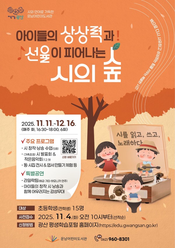 또 11월 11일부터는 ‘시의 언어로 가득한 도서관’이라는 이름으로 초등학생 대상 시 창작 프로그램이 시작된다. 아이들은 직접 시를 쓰고 낭송하며 자신만의 감정을 표현하고, 도서관은 작품 전시와 체험 활동을 함께 운영해 창작의 즐거움을 높일 계획이다.