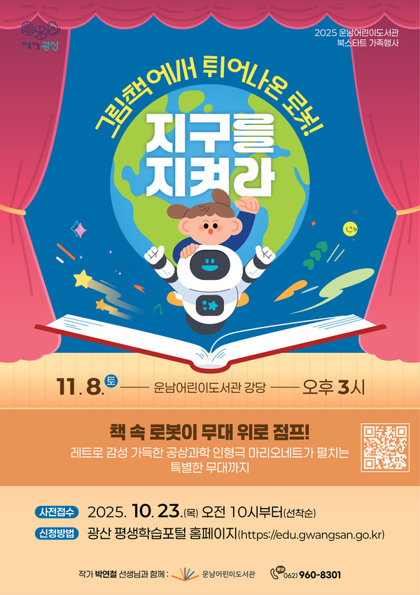 11월 8일에는 가족이 함께 즐길 수 있는 북스타트 행사 ‘그림책에서 튀어나온 로봇! 지구를 지켜라’가 마련된다. 그림책을 소재로 한 공연과 체험이 어우러져 아이들이 책 속 이야기를 생생하게 느낄 수 있는 시간이 될 전망이다.