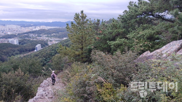 보광제 1.1km 이정표 갈림길에서 남고산을 가려면 오른쪽으로 꺽어야 한다. 왼쪽은 학산으로 빠지는 길이다. 오솔길 수준의 편안한 숲길 중간에 아기고래 모양의 바위를 지나면, 도보 여행객들을 위한 ‘도란도란 시나브로길’ 이정표가 있다. 왼쪽은 천경대, 심경사로 내려가게 되고, 오른쪽은 관성묘와 북장대, 억경대로 올라간다. 어느 쪽이나 기다란 성벽을 따라간다. 성벽을 걷는 것도 상당한 체력이 소모되지만, 달그락거리는 돌들이 고정이 되지 않아서 미끄럼에 주의해야 한다.