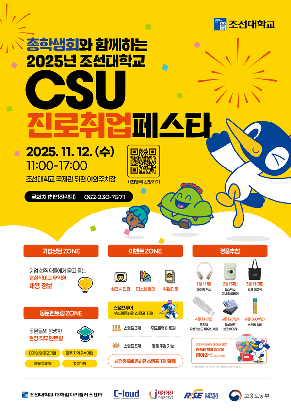 조선대는 오는 12일 캠퍼스 일원에서 ‘2025 CSU 진로취업페스타’를 개최하고, 지역 청년과 재학생을 대상으로 다양한 맞춤형 취업 지원 프로그램과 현장형 멘토링을 운영한다.