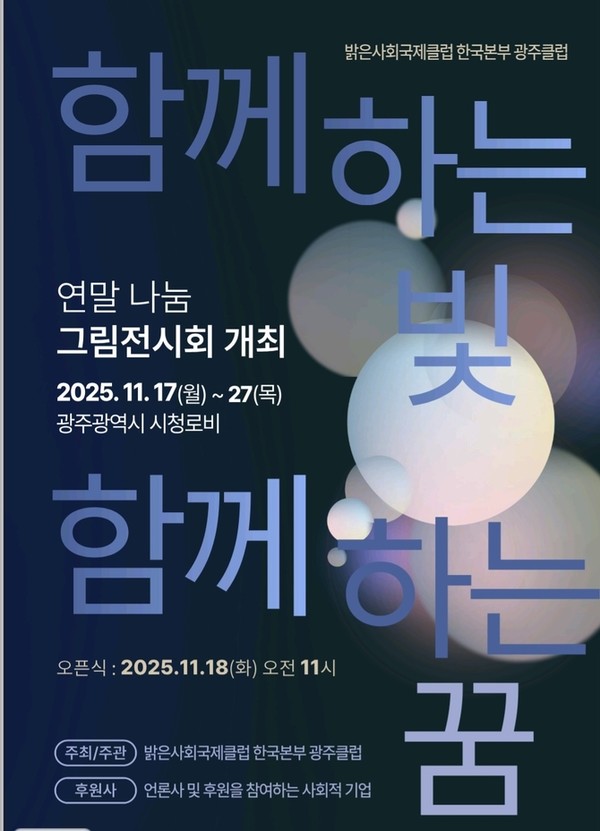밝은사회국제클럽 한국본부 광주클럽(회장 정성균)이 연말 나눔 그림 전시회 ‘함께하는 빛 함께하는 꿈’을 개최한다.