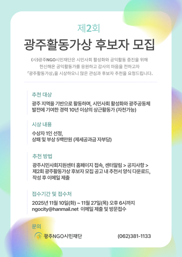 후보자 추천 기간은 10일(월)부터 27일(목)까지이며, 추천은 광주시민사회지원센터 홈페이지에서 관련 서류를 확인하여 이메일(ngocity@daum.net) 또는 직접 방문접수도 가능하다.