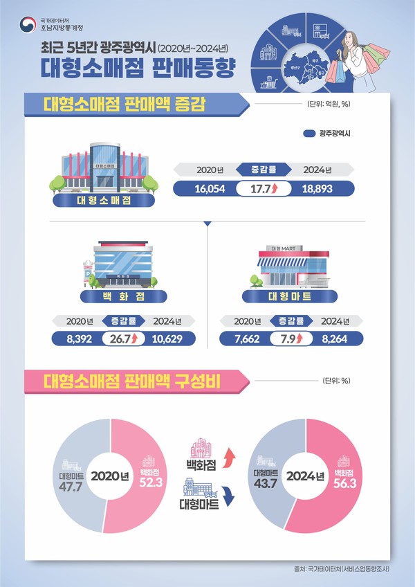 최근 호남지방통계청이 발표한 ‘최근 5년간 광주광역시 대형소매점 판매동향’ 자료에 따르면, 2024년 광주지역 대형소매점(백화점·대형마트) 판매액은 1조 8893억 원으로 집계됐다. 이는 2020년 1조 6054억 원보다 17.7%(2839억 원) 증가한 수치지만, 7개 특·광역시 중 6위에 그쳤다.