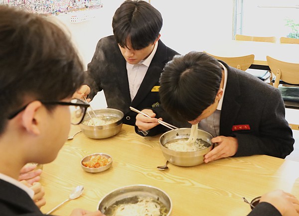 지역 나눔실천에 앞장서는 광주 대동고등학교(우정석 교장) 학생들이 19일 천원국시 화정점에 50만 원 상당의 국수 재료를 후원했다.
