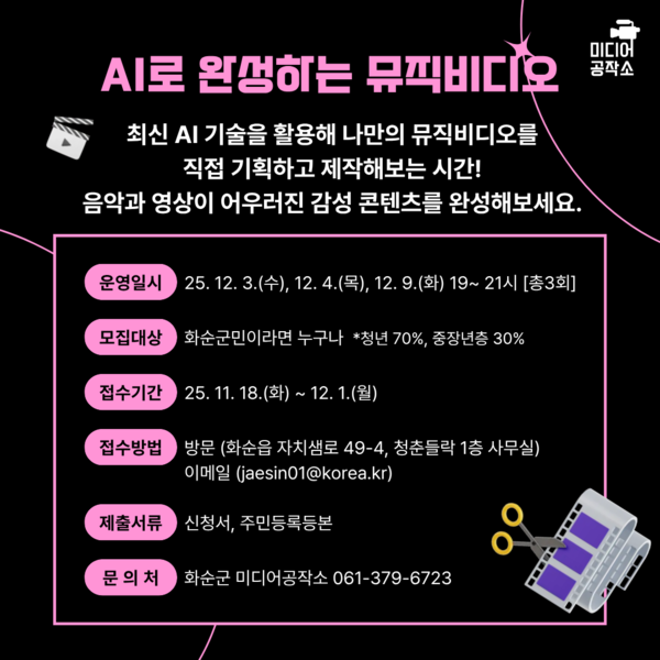 화순군(군수 구복규)이 지역 청년들의 디지털 역량 강화와 창작 활동 지원을 위해 생성형 AI 기반 뮤직비디오 제작 교육을 마련한다. 군은 오는 12월 3일부터 화순군 청년센터(청춘들락) 미디어공작소에서 ‘AI로 완성하는 뮤직비디오 영상 제작하기’ 교육을 진행한다고 21일 밝혔다.