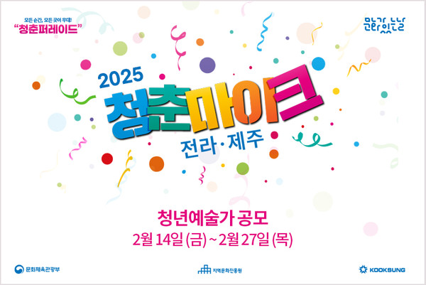 청년예술가들에게 무대 기회를 제공하는 ‘2025 문화가 있는 날 청춘마이크 전라·제주’가 참가자를 모집한다. 모집 기간은 27일 오후 6시까지며 열정과 재능을 가진 대한민국 청년예술가라면 누구나 지원 가능하다.