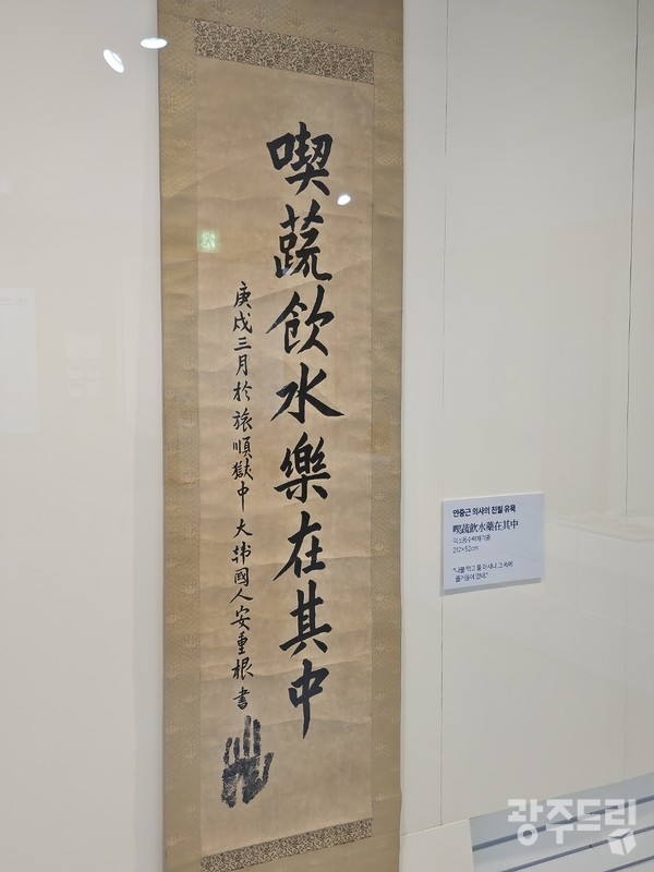 이번 전시에서 특히 주목되는 것은 지금까지 공개된 적 없던 안중근 의사의 친필 유묵 ‘끽소음수락재기중(喫蔬飮水藥在其中)’이다. “나물 먹고 물 마시니 그 속에 즐거움이 있네”라는 뜻의 이 글은 평화로운 세상에서 소박한 삶을 갈망했던 안중근 의사의 내면세계를 잘 나타낸다. 또한 글 아래 찍힌 안중근 의사의 손바닥 낙관이 그의 결연한 의지를 전한다.