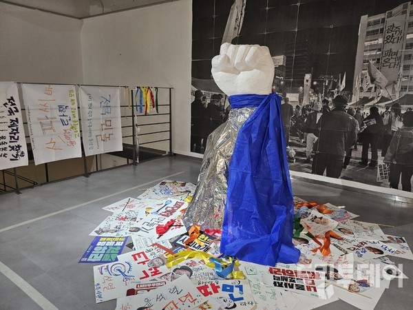이밖에도 민중의 역사를 대표하는 인물들이 빛의 혁명에 참여하는 작품, 총탄 자국을 연상시키는 구멍으로 아내와 세 딸들의 형상을 만든 작품, 123일 동안 윤석열 파면까지의 시민저항의 몸짓을 당시 쓰였던 피켓과 깃발 등을 수집해 기록한 작품 등 다채로운 작품을 만나볼 수 있다.