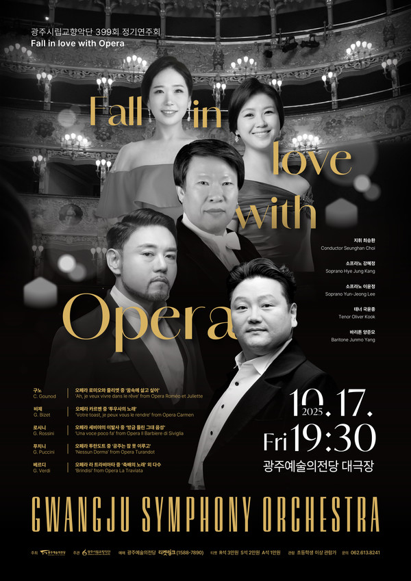 광주시립교향악단은 오는 10월 17일(금) 오후 7시 30분, 광주예술의전당 대극장에서 399회 정기연주회 'Fall in love with Opera'를 개최한다. 이번 무대는 대한민국 오페라계를 이끄는 최정상 성악가들이 총출동해 가장 사랑받는 오페라 명장면과 아리아들을 한자리에서 감상할 수 있는 오페라 갈라 콘서트로 꾸며진다.